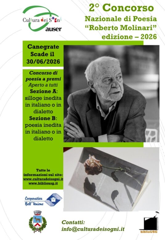 Dopo il successo della prima edizione 2024, l’Associazione AUSER-Cultura dei Sogni e la Cooperativa Edificatrice Bell'Unione, con sede in Canegrate (MI) organizzano, in collaborazione con il Comune di Canegrate, la seconda edizione del Concorso nazionale di Poesia “Roberto Molinari”, in ricordo di una figura molto amata nel nostro territorio per la sua lunga attività sindacale, il suo impegno nel sociale e la passione per la poesia.