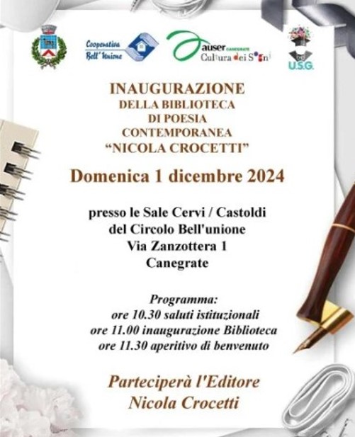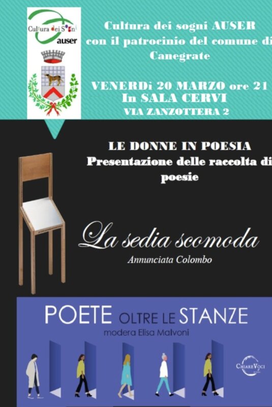 Annunciata Colombo, poetessa di Canegrate, presenterà la sua nuova raccolta "La sedia scomoda", in dialogo con Elisa Malvoni. In passato ha pubblicato Fragüi (Briciole, 2015), Biciuchiti (Mughetti, 2016), Ul pegagn su ’na cardega (2019) e Ul Principìn (Il Piccolo Principe in dialetto canegratese, 2022), opere che testimoniano il suo amore per il dialetto canegratese e per la vita quotidiana. La serata sarà dunque occasione per riscoprire una voce poetica radicata nella tradizione locale e sempre capace di emozionare.